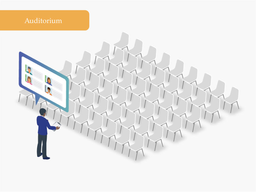Auditorium seating features rows facing a stage or podium—ideal for large speaker sessions.